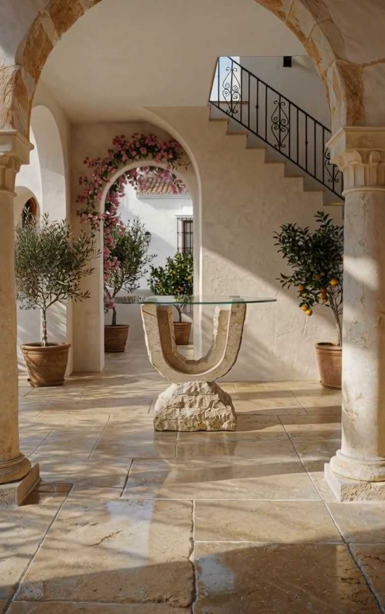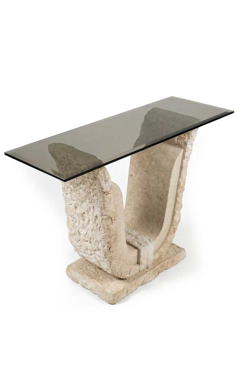 | **Sculpturale 'U'-console van Mactan-steen en kristal - Minimalistisch