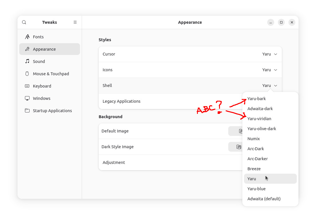 In GNOME Tweaks (Appearance → Shell), the Shell theme drop-down list